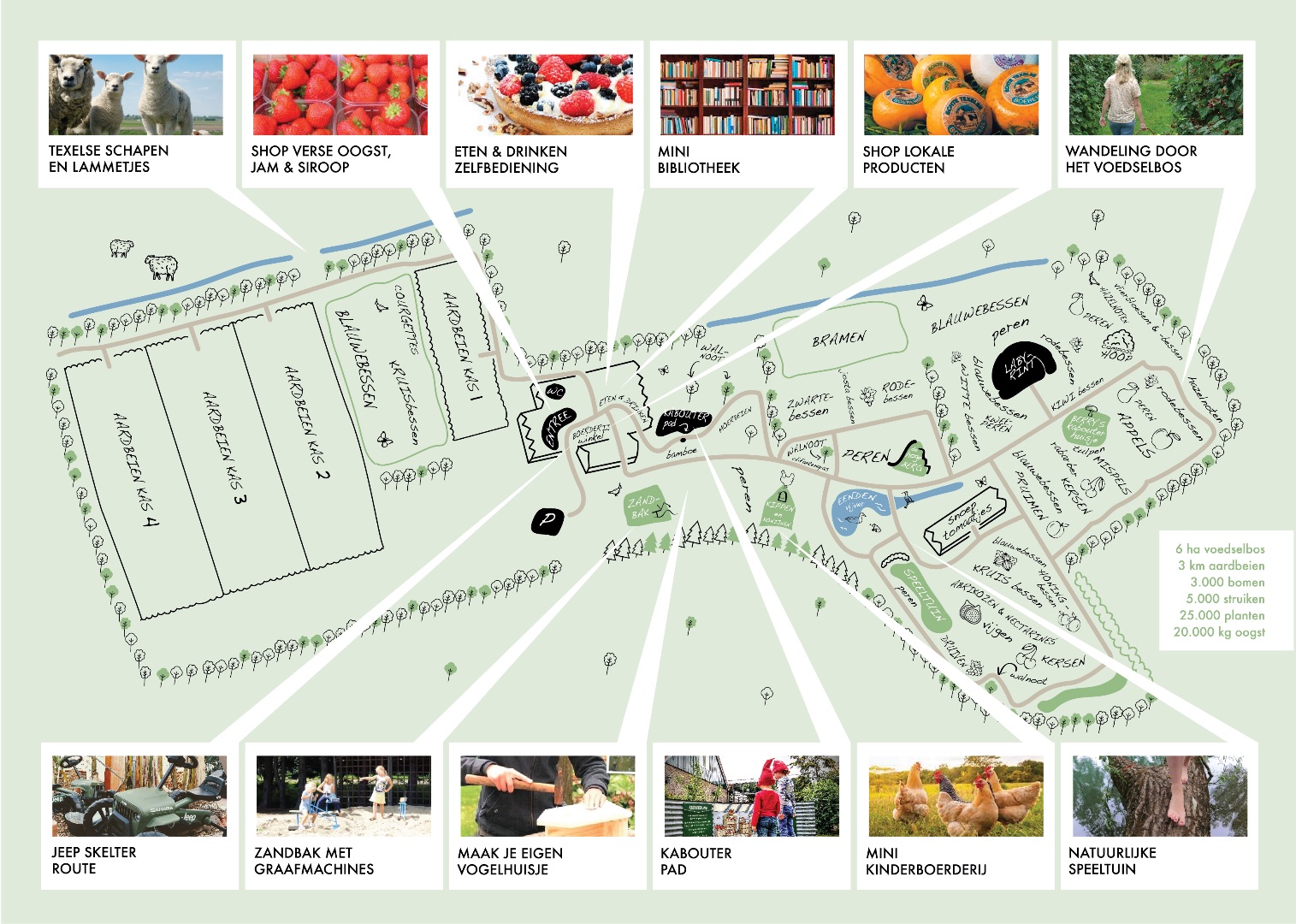 Dagelijks zijn er verschillende soorten fruit te plukken. De voorraad hangt af van de rijping en het aantal bezoekers.